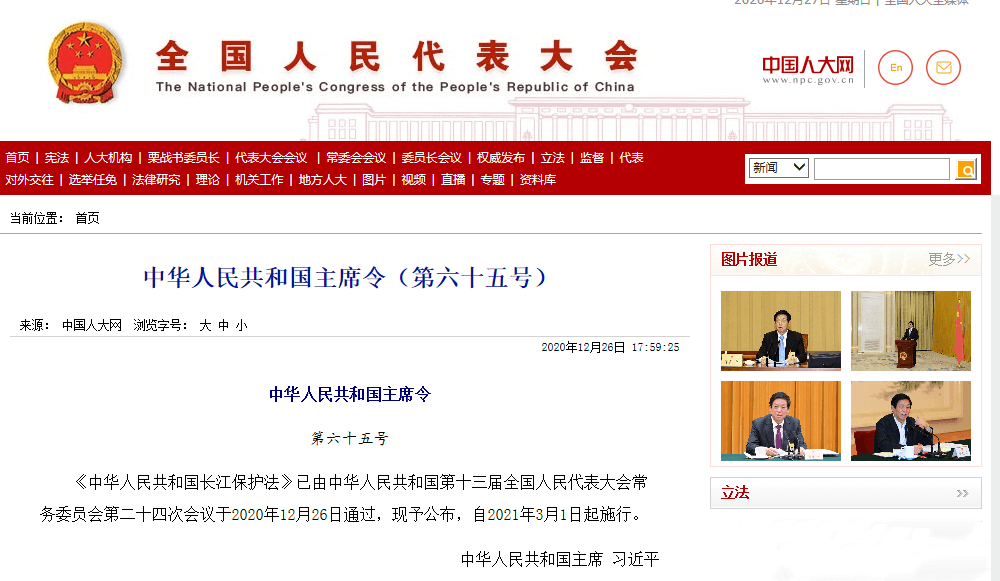 据中国砂石协会了解,国家主席习近平于2020年12月26日签发第六十四号、六十五号、六十六号、六十七号、六十八号中华人民共和国主席令。第六十五号主席令说,《中华人民共和国长江保护法》已由中华人民共和国第十三届全国人民代表大会常务委员会第二十四次会议于2020年12月26日通过,现予公布,自2021年3月1日起施行。